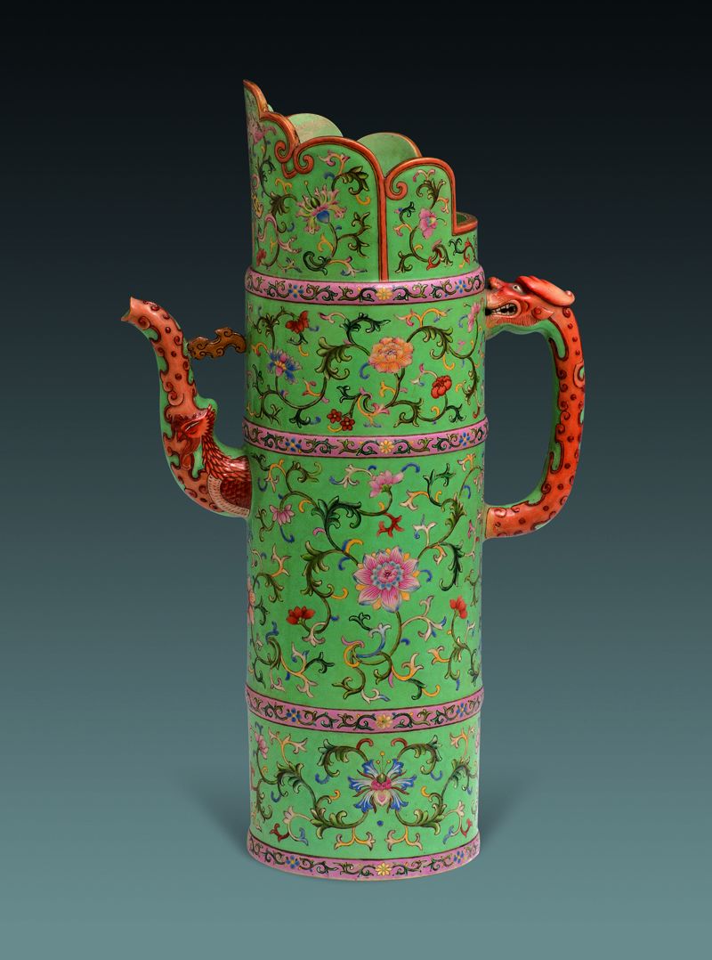 清代瓷器多穆壶纹饰繁缛华丽,器身前置凤首流,后设龙形执柄。