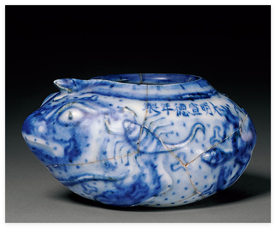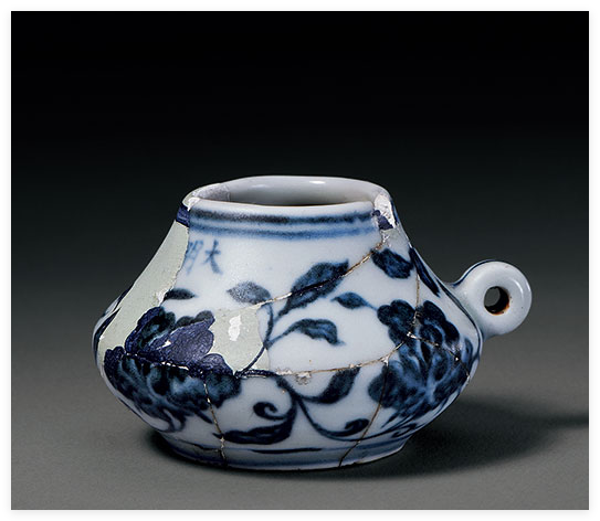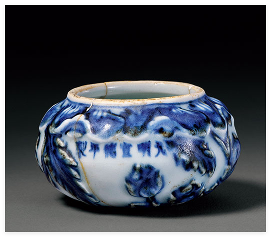 3.景德镇珠山明代御窑遗址出土的宣德青花鸟食罐使用的都是进口的苏麻离青青料,有苏麻离青特有的铁锈斑。