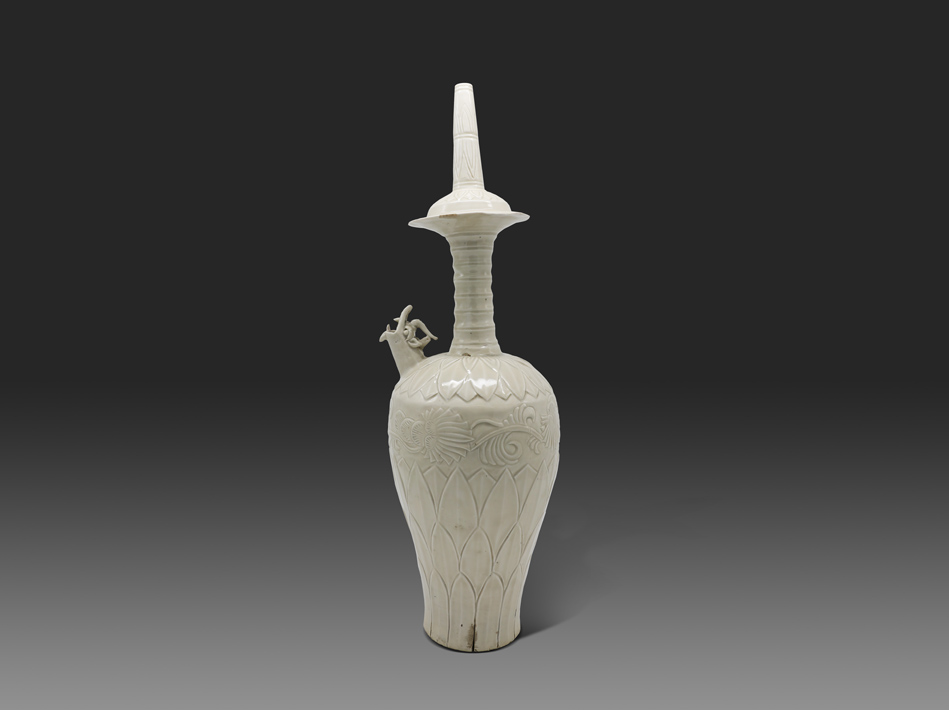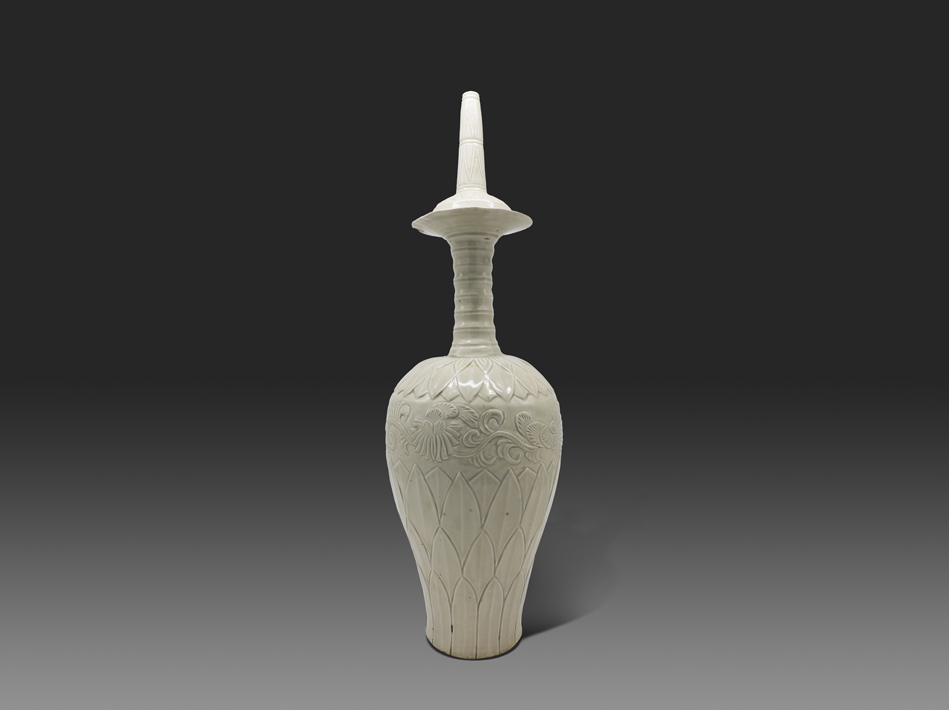 定窑白釉刻花龙首净瓶 高60.9厘米 腹径19.1厘米 底径10.1厘米 ,瓶细长颈,颈中部出沿,颈上部为仰覆莲瓣纹,中部为覆莲纹相轮圆盘,下部为竹节纹。定窑瓷器一般都是以小型器物为主,大器十分少见。此件器物形体高大,造型隽秀,装饰华丽,为定窑瓷器中最为精美的一件。