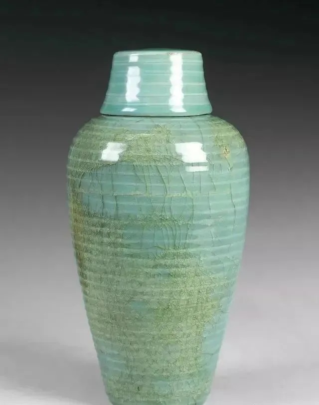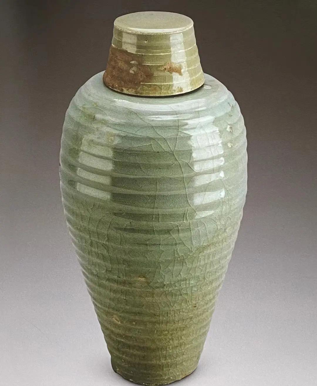 4.程大雅墓出土的龙泉窑青瓷弦纹带盖梅瓶在这个时期龙泉窑已经开始采用多次上釉的工艺 ,而多次上釉工艺是厚釉瓷器出现的基础。腹部大部分区域布满密集的开片纹,开片处泛黄,釉层莹润。