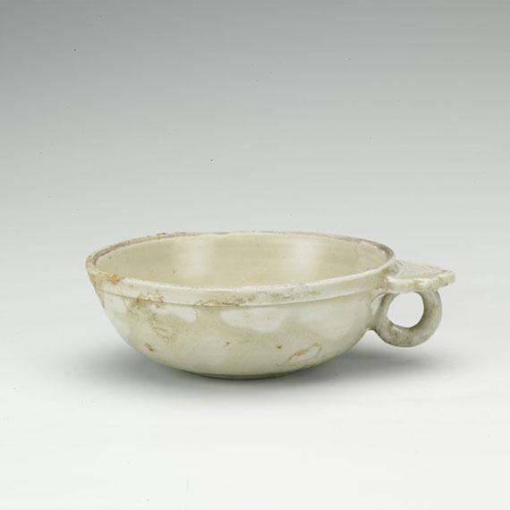 陈庆墓出土的白釉单柄洗,白釉,芒口,白胎,釉层薄厚不均,有冰裂纹。边缘呈花舞状,上有凹纹两圈。内底饰莲花纹,属划花。花一侧划双线,轮廓都曾用刀剔过,周以凹弦纹。
