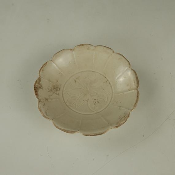 陈庆墓出土的白釉划花花口瓷盘芒口,浅曲腹,满釉,白中闪黄。口部作十二瓣花口状,每个口沿豁口处向下至近弦纹处有凸棱一道,内底画莲花朵,并以植物枝叶图案陪衬。花瓣一侧或两侧画双线,或用刀剔出轮廓,或在花纹一侧用刀剔过。