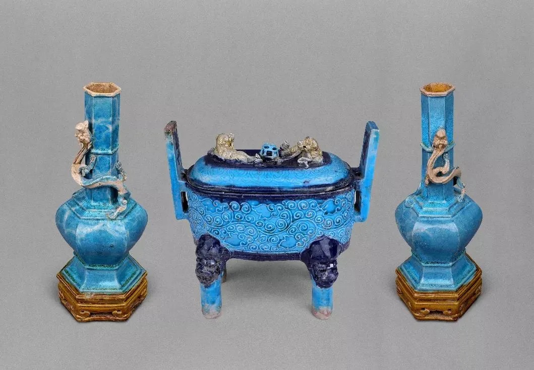四川省成都市红牌楼蜀王府太监墓群出土明代嘉靖时期仿珐华彩堆塑狮纹带盖鼎式炉