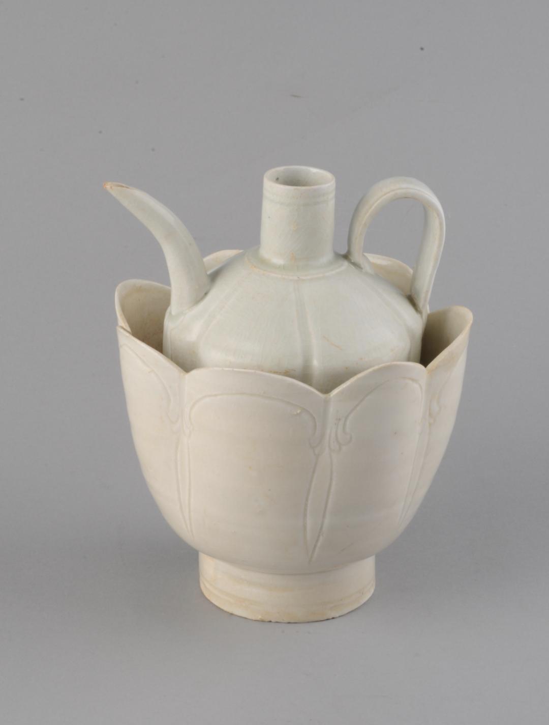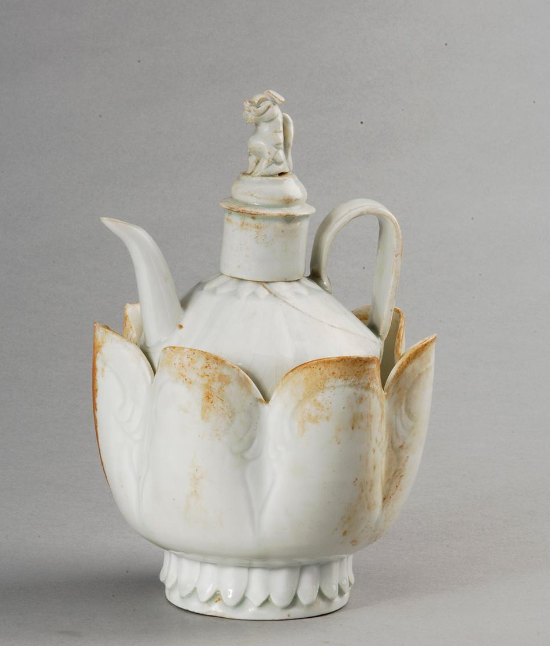 吴正臣夫妇墓中出土的德镇窑青白釉注子注碗由注子和注碗组成。注子为小口,直颈,颈下肩上饰一周覆莲瓣纹,斜折肩,六棱形腹,前置上扬的细流,与壶口齐平。后置带式曲柄,高圈足。套盖,盖顶蹲一狮,昂首翘尾,富于装饰趣味。注子表面施青白釉,釉色光润明亮,有冰裂纹。注碗为一朵仰开的莲花,共计七瓣,在相邻两个莲瓣接合处饰如意纹。