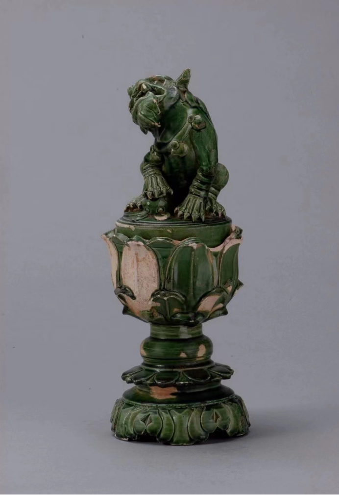 吴正臣夫妇墓中出土一件吉州窑绿釉狡貌香炉,通高三十二厘米,炉身是覆莲座上捧出的一朵莲花,花心里的莲蓬便是香炉盖,盖顶一只戏球的坐狮,偏着头,张着口。这跟宋代喜欢焚香有很大关系。