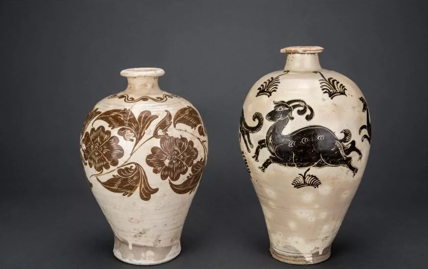 白釉黑彩动物纹梅瓶通体施白釉,图案为白地黑 彩,共有五只动物,分别为一只梅花鹿、一只羊、两只狗和一只兔子,均匀分布在梅瓶的四个面。