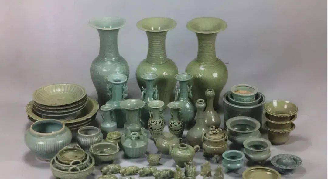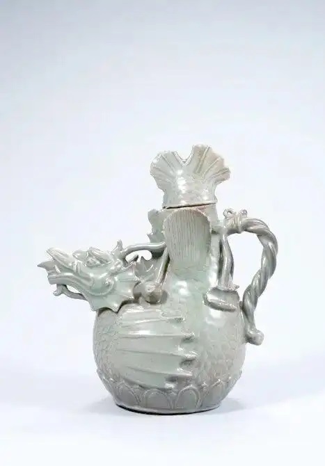 新安沉船出水龙泉瓷器器形种类增多,新出现高足杯、菱口盘、凤尾尊、荷叶盖罐、胆式瓶、玉壶春瓶、双环耳瓶炉、瓶、罐、注子、塑像、盏、盏托等器型。