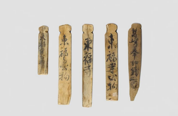 新安沉船还出水了墨书木简364支,应为沉船的货物标签,其中一件墨书有“至治三年”(1323年),为判别沉船年代提供了重要依据。木简墨书铭文还有“东福寺”、“钓寂庵”、“答琦宫”等日本寺社名,“东已三郎”、“七今二郎”、“卫门次郎”、“本七今二郎”、“协冲二郎”、“又三郎”等日本人名,还有“纲司”等字样。根据出水文物的特征、墨书文字,指明了这批货物的去向。推断新安沉船应该是元至治三年(1323年),从庆元港(宁波港)出发的,前往日本的博多港(今福冈)进行贸易。行至途中遭遇不测,不幸沉没在高丽新安(今韩国新安)外海域。