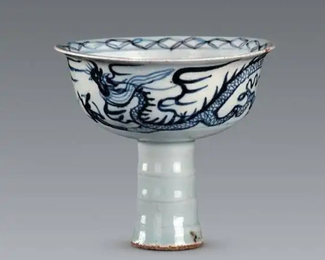 河北泊头市张庄出土两件龙纹青花高足杯龙纹是元代典型的细长脖龙,比较飘逸和洒脱。