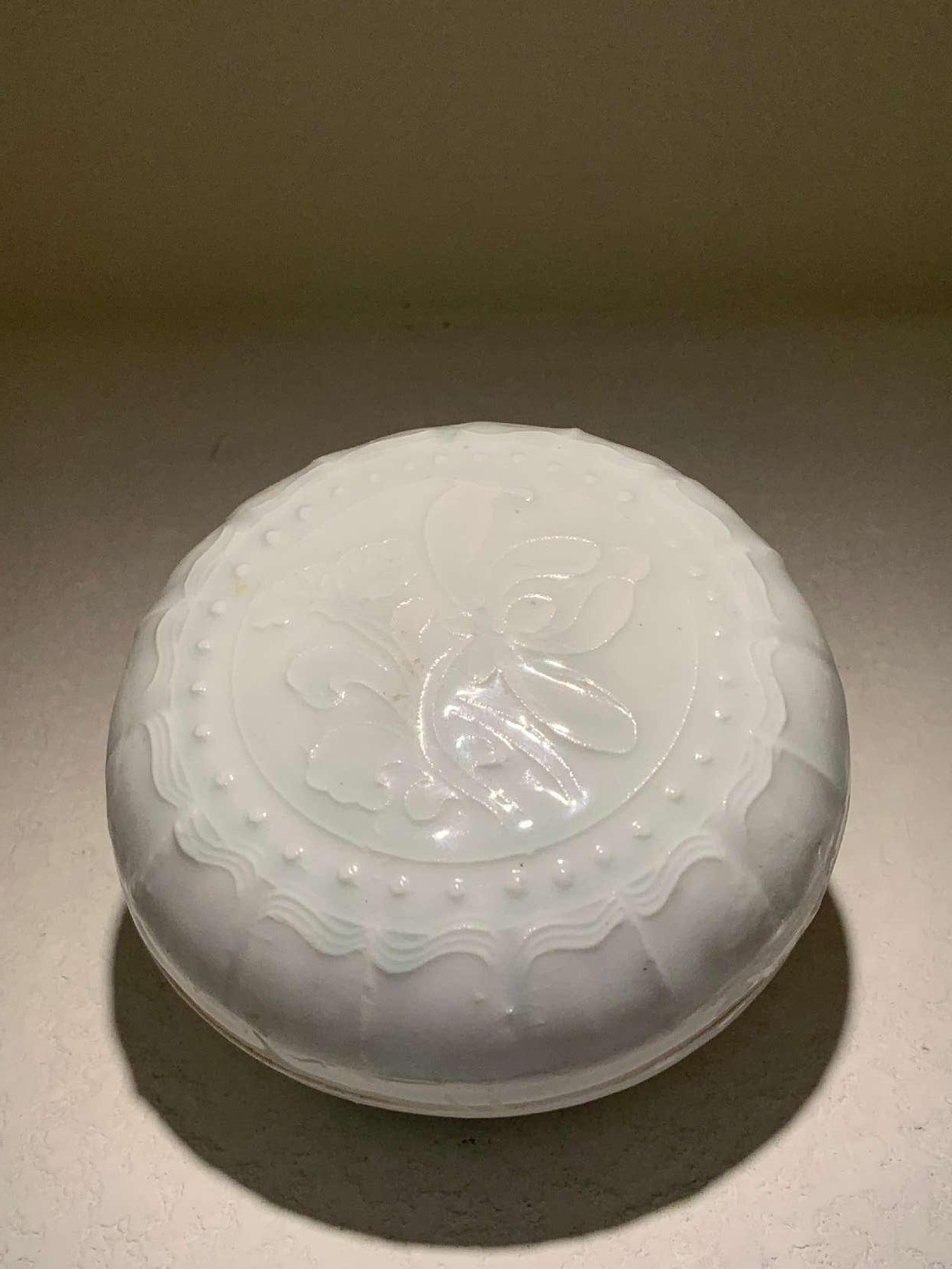 明德化窑荷叶洗形状如一片倒垂的荷叶,叶边自然卷翘,呈不规则的六弧口,叶茎从内底中心拱起,伸向口沿外接一枝花茎,横贴外底,于底沿处露出一朵含苞欲放的荷蕊。