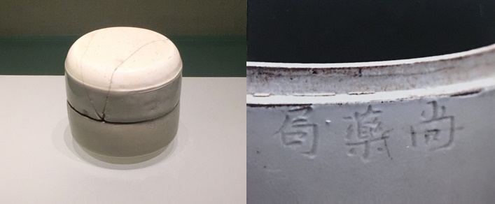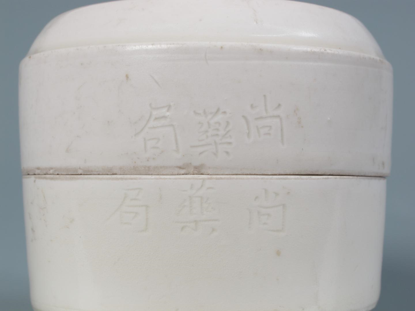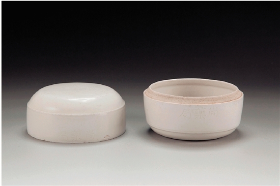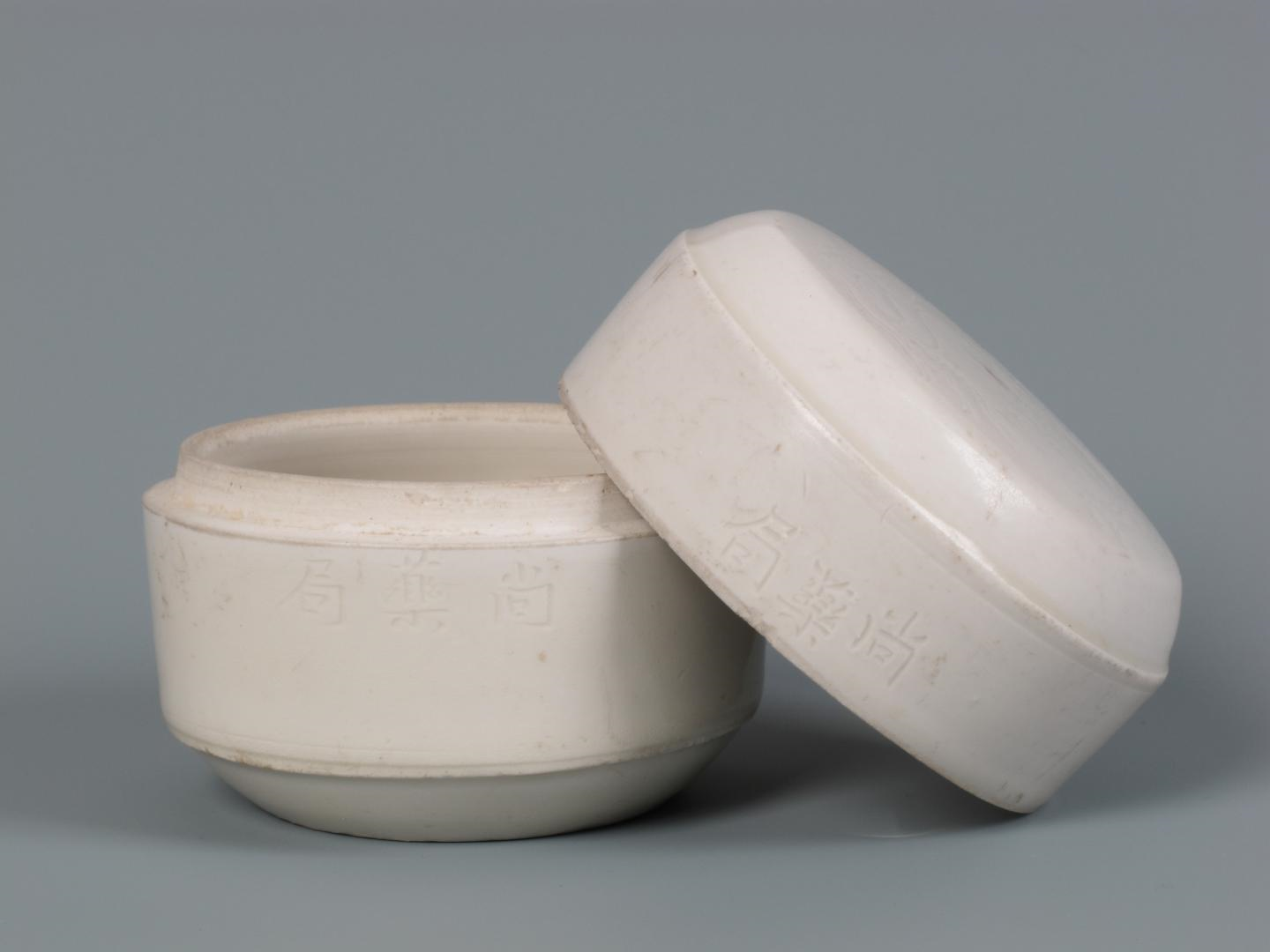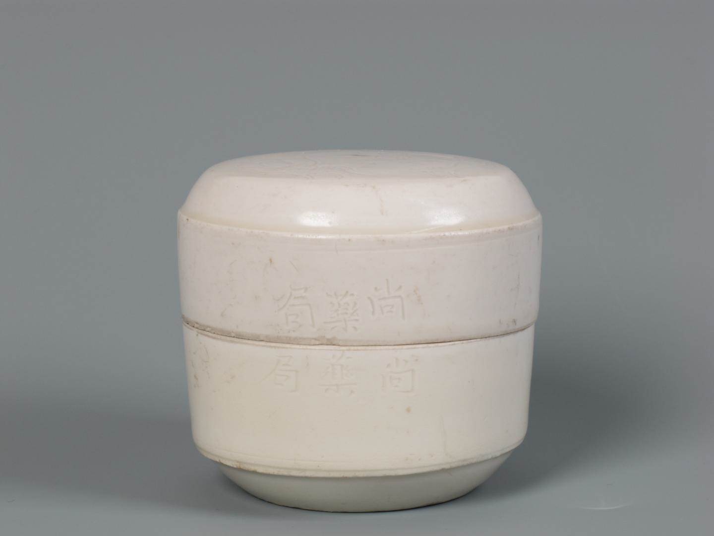 河北省博物院“尚药局”白瓷盖盒高6.5厘米 口径7厘米,盒为子口,直壁,平底;盖为平顶,杀角,直壁。盖顶刻龙纹,盒盖与盒身的口沿处分别刻楷书“尚药局”三字。胎体洁白,釉色白中微微泛黄。