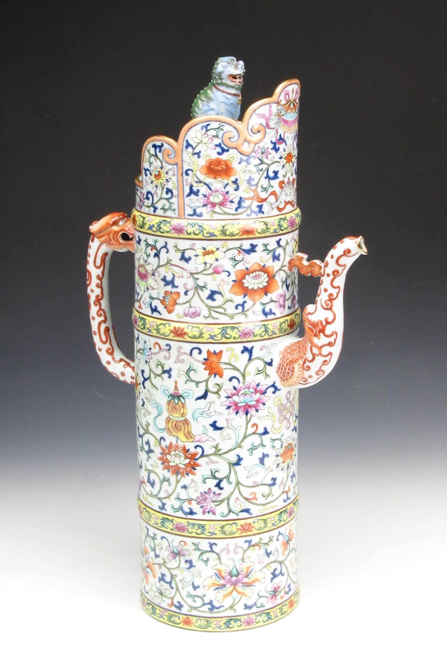 清代瓷器多穆壶纹饰繁缛华丽,器身前置凤首流,后设龙形执柄。