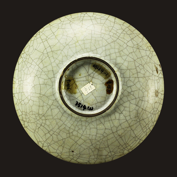 11件哥窑瓷器都是紫口铁足,符合宋代哥窑的时代特征,哥窑盘口沿露紫口,底足上釉,矮圈足,圈足内有六个支烧钉。