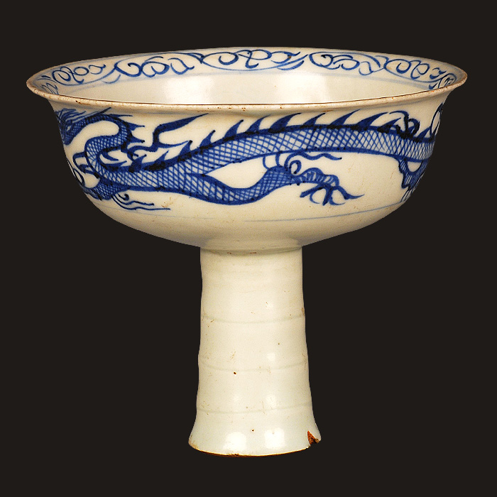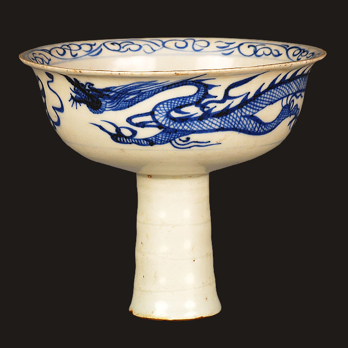 一件元景德镇窑青花云龙纹高足碗,碗侈口,陡腹,竹节形高足,足下部稍外侈。