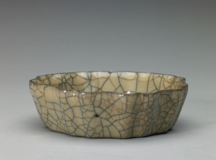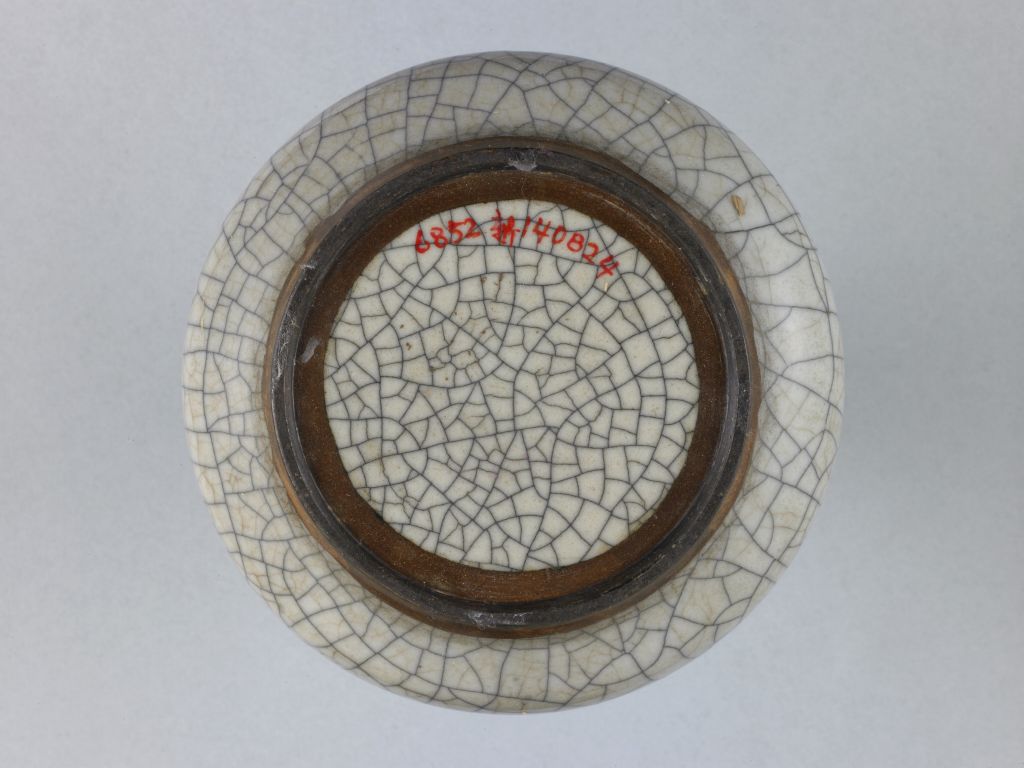 宋代哥釉瓷器均为失透的乳浊釉,釉色浑厚细腻,光泽莹润,如同凝脂。宋代哥釉瓷器釉面间迸裂有大小不一,或密匝或疏落的冰裂状网纹,深浅不一,如网如织,深纹片呈黑色,浅纹片呈黄色,俗称“金丝铁线”纹。“金丝铁线”纹形成的原因是哥釉瓷器的坯体与釉的膨胀系数不同,在窑内冷却的过程中釉因收缩率大而开裂,开裂时间可持续多年。