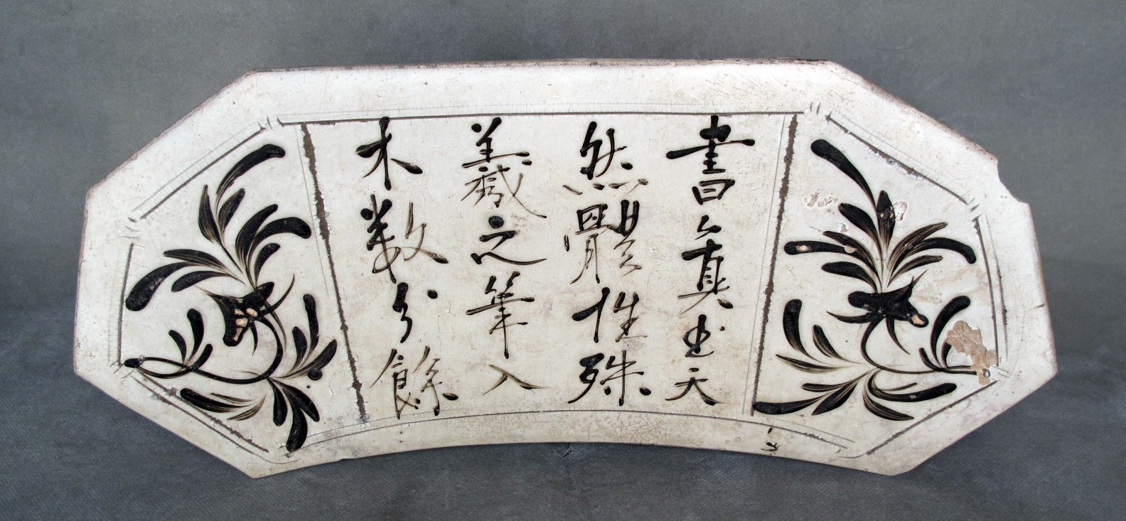 3.河津窑金代瓷枕剔花填黑技法非常流行,白如凝脂,黑似刷漆,将黑与白的碰撞演绎到了极致。