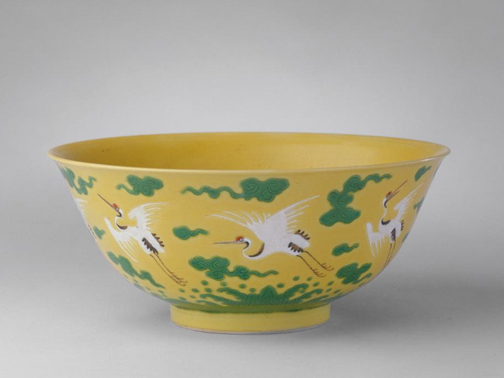 瓷器的黄地绿彩釉色创烧于始创于明代永乐时期,以后的明代的宣德、弘治、正德、嘉靖朝均有烧造,清代也大量烧造黄地绿彩釉色瓷器,不过有严格的等级,只有明清皇宫才能使用黄地绿彩瓷器。