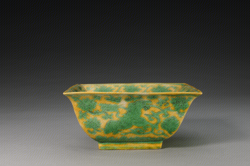 黄地绿彩釉色属于低温釉瓷器,采用低温釉彩二次烧成工艺。黄地绿彩瓷器烧造工艺是先在坯胎上锥刻好暗纹纹样,高温烧造好素胎。然后在烧造好的素胎瓷器上纹饰上填低温铅绿釉,隙地填低温黄釉为地,最后二次入窑低温烧造而成。