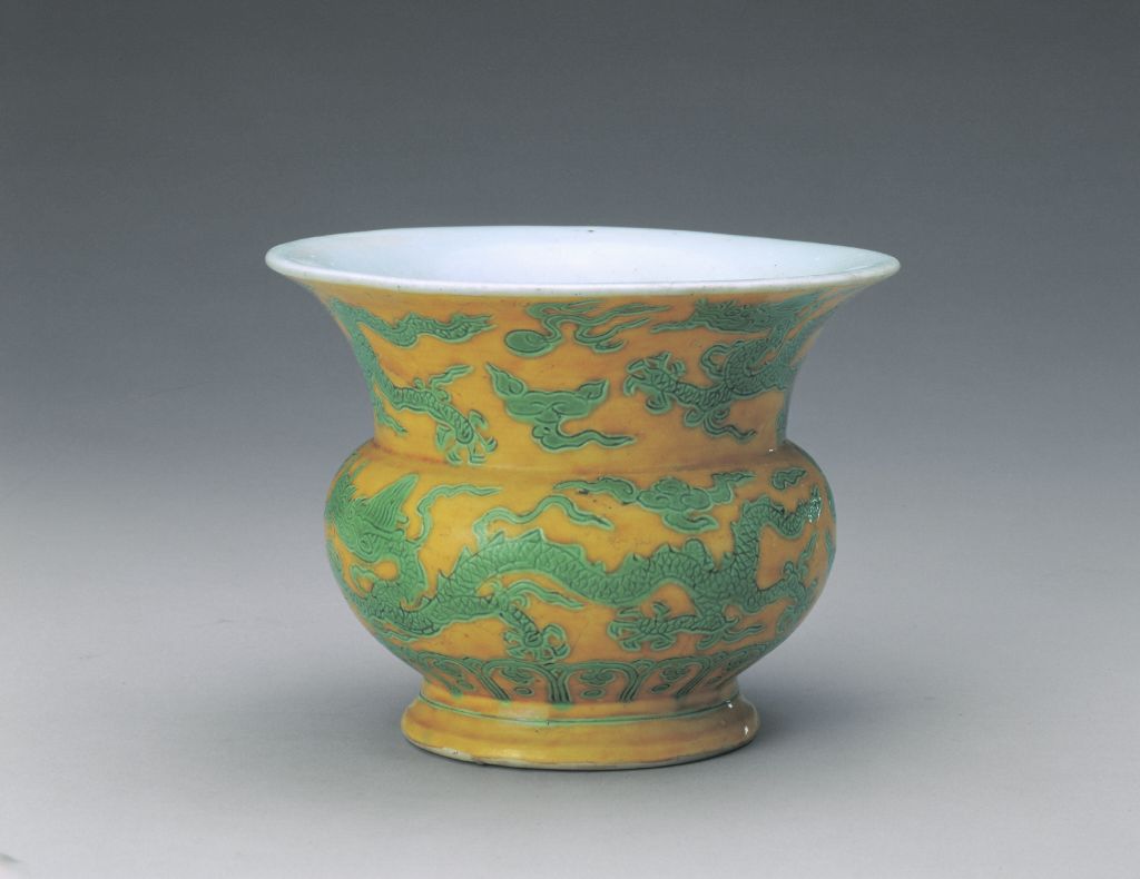 黄釉瓷器是明清皇家控制最严格的一种釉色,明清两代黄釉器只有皇家才能使用,有严格的等级差异。黄地绿彩龙纹器则定为贵妃、妃等级专用,平民老百姓如果使用就以僭越论处。
