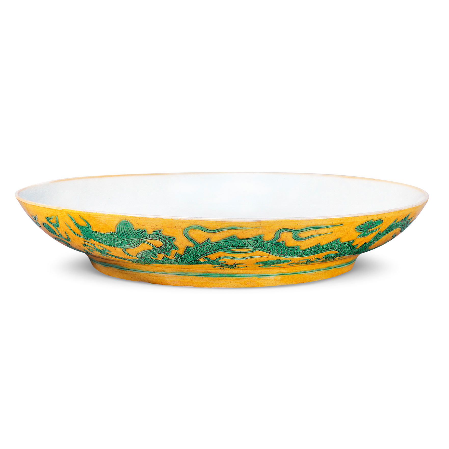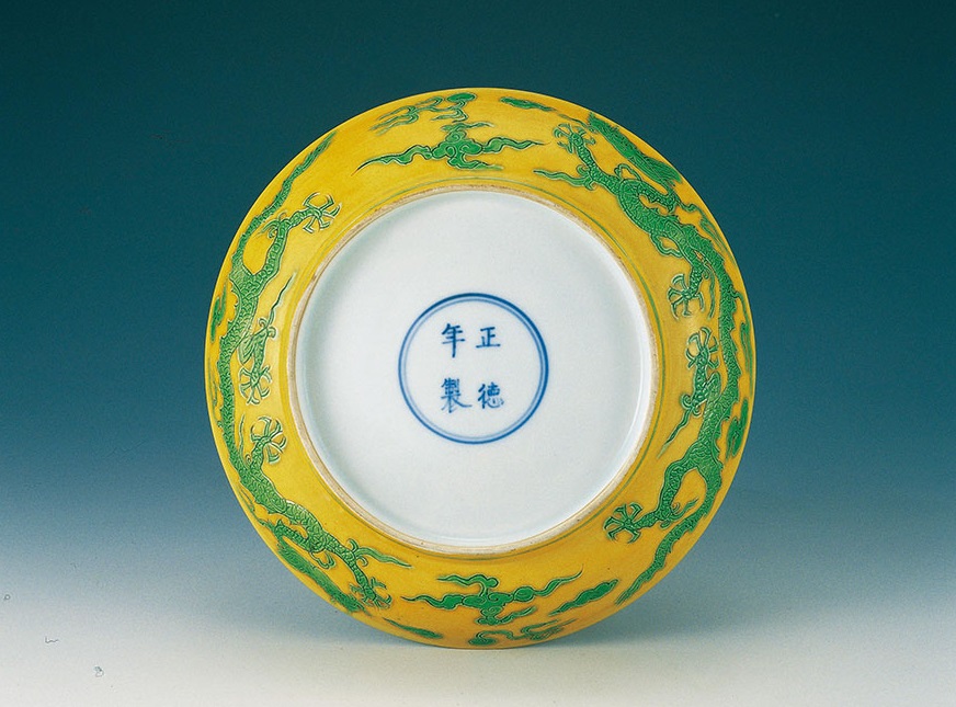 黄地绿龙盘胎体厚薄均匀,绿彩柔和,黄彩娇嫩,外壁黄釉为地,刻云龙纹并填绿彩。