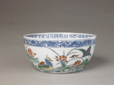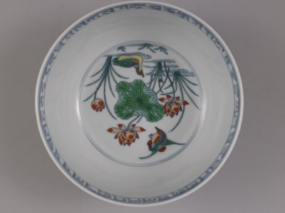 斗彩鸳鸯卧莲碗形制秀美,在洁白的釉面衬托下纹饰色彩鲜艳,画面生动,富有自然情趣。
