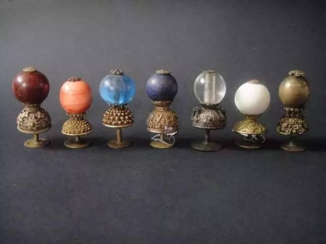 在清代早期顶珠由各种不同颜色的宝石制成,至雍正后朝廷为了节省开支和提倡节俭,所有顶珠皆由相应颜色的琉璃来取代宝石。