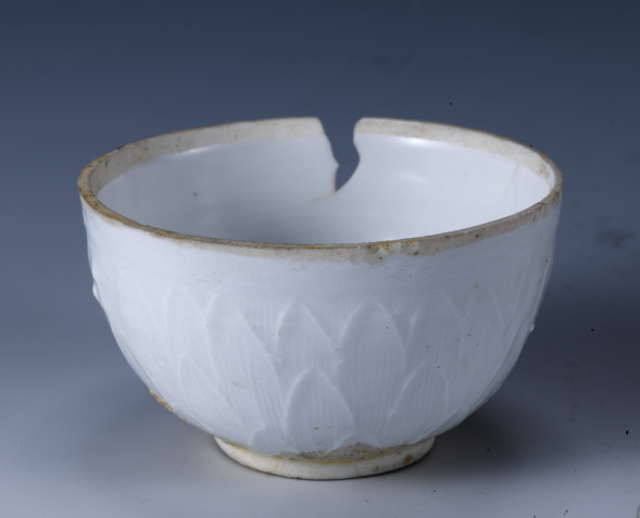 白釉莲瓣纹碗白胎,胎质坚实,内外施白釉,足底无釉。芒口,直深腹,圈足。器体外腹模印双重仰莲纹,器形较大,装饰手法细腻优美。