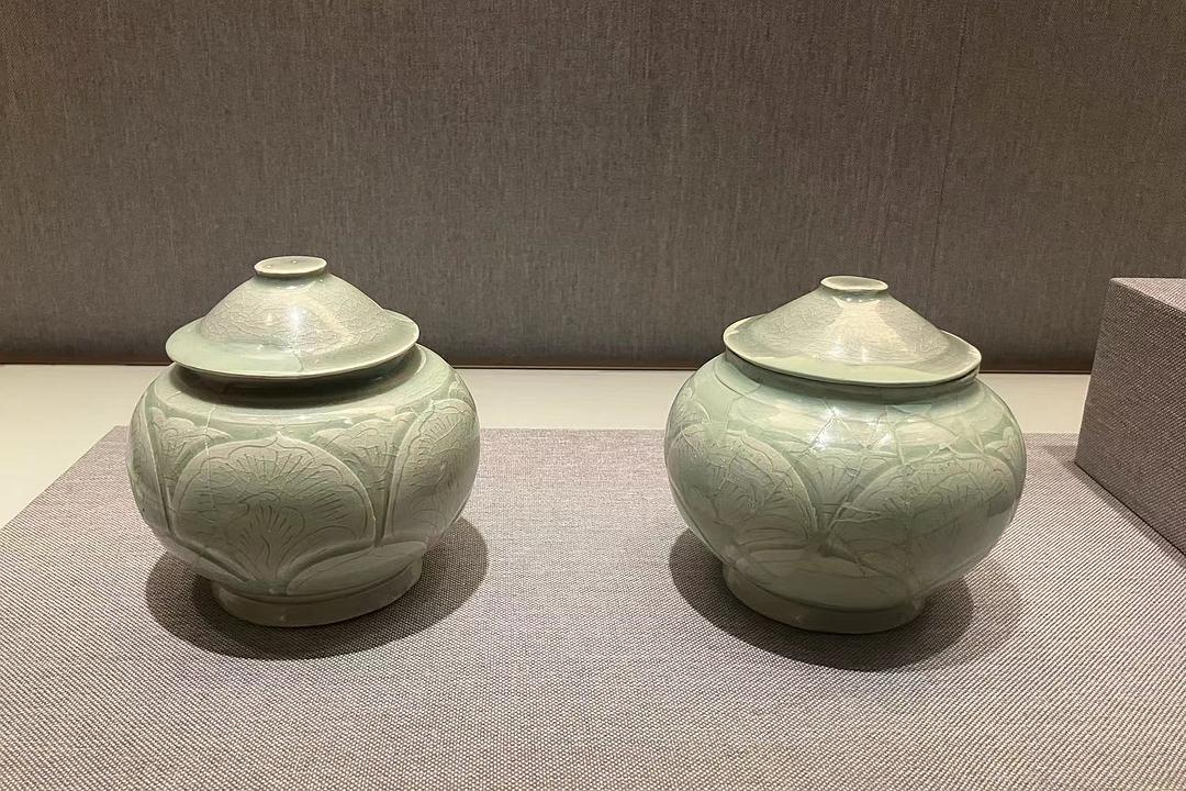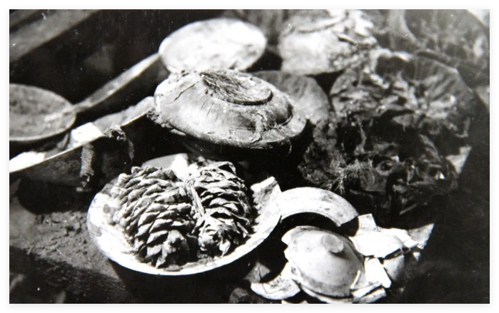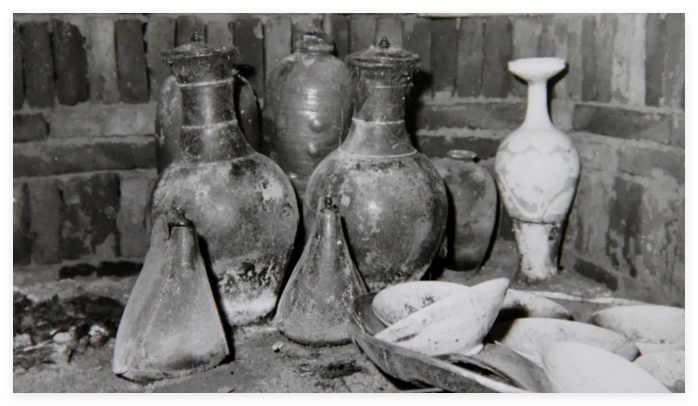 室内的中间后部棺前正中地上置石供桌,桌上满陈漆钵与碗、罐等瓷器,内装食品,现还有桃、李(存果核)、松子(松塔)等。桌下是两件白瓷注壶。