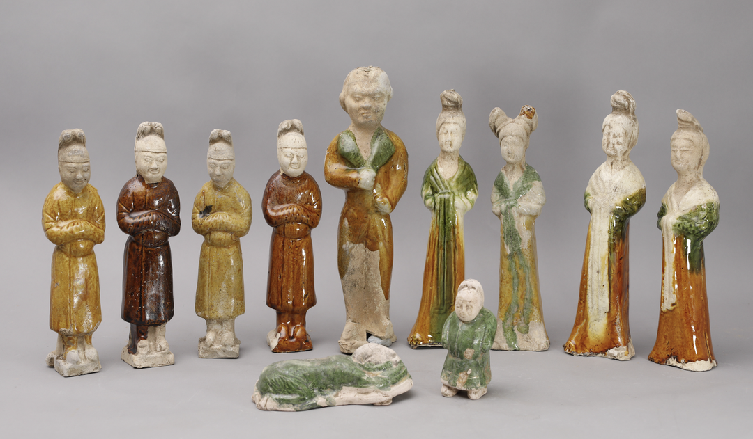 棺床东侧自墓门至墓室北壁随葬50余件唐三彩,因墓顶早年破坏,坍塌墓砖覆压造成个体较大三彩俑破裂。山东济南樊家遗址M49墓是山东地区考古出土唐三彩俑数量最多的。