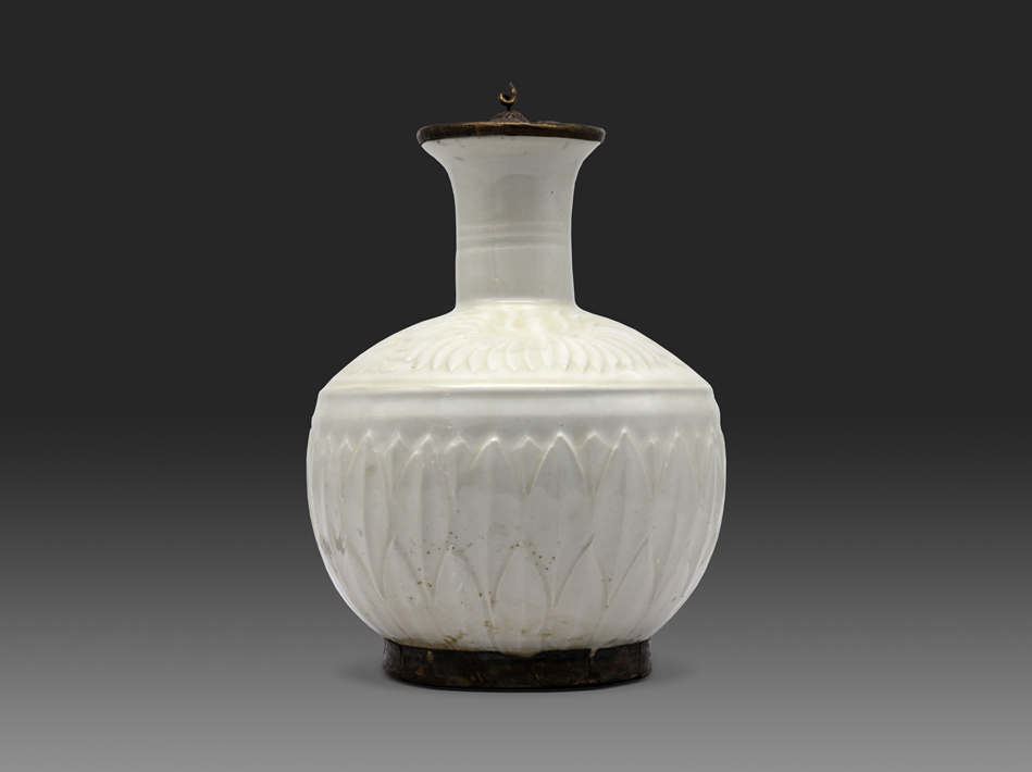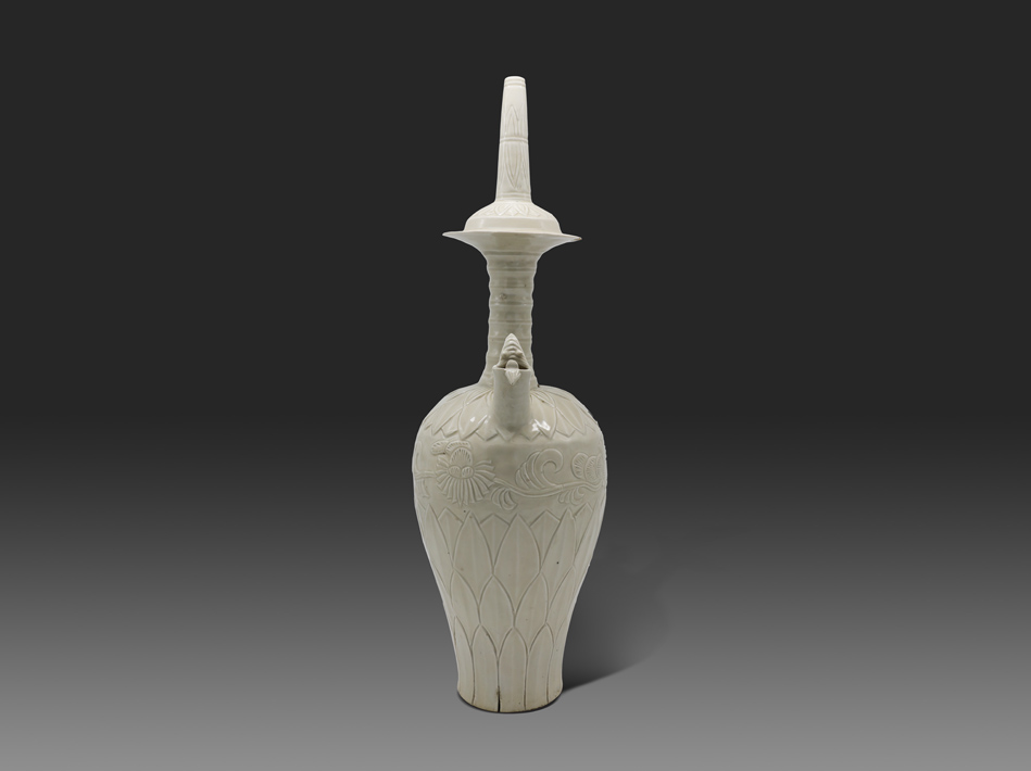 定窑白釉刻花龙首净瓶 高60.9厘米 腹径19.1厘米 底径10.1厘米 ,瓶细长颈,颈中部出沿,颈上部为仰覆莲瓣纹,中部为覆莲纹相轮圆盘,下部为竹节纹。定窑瓷器一般都是以小型器物为主,大器十分少见。此件器物形体高大,造型隽秀,装饰华丽,为定窑瓷器中最为精美的一件。