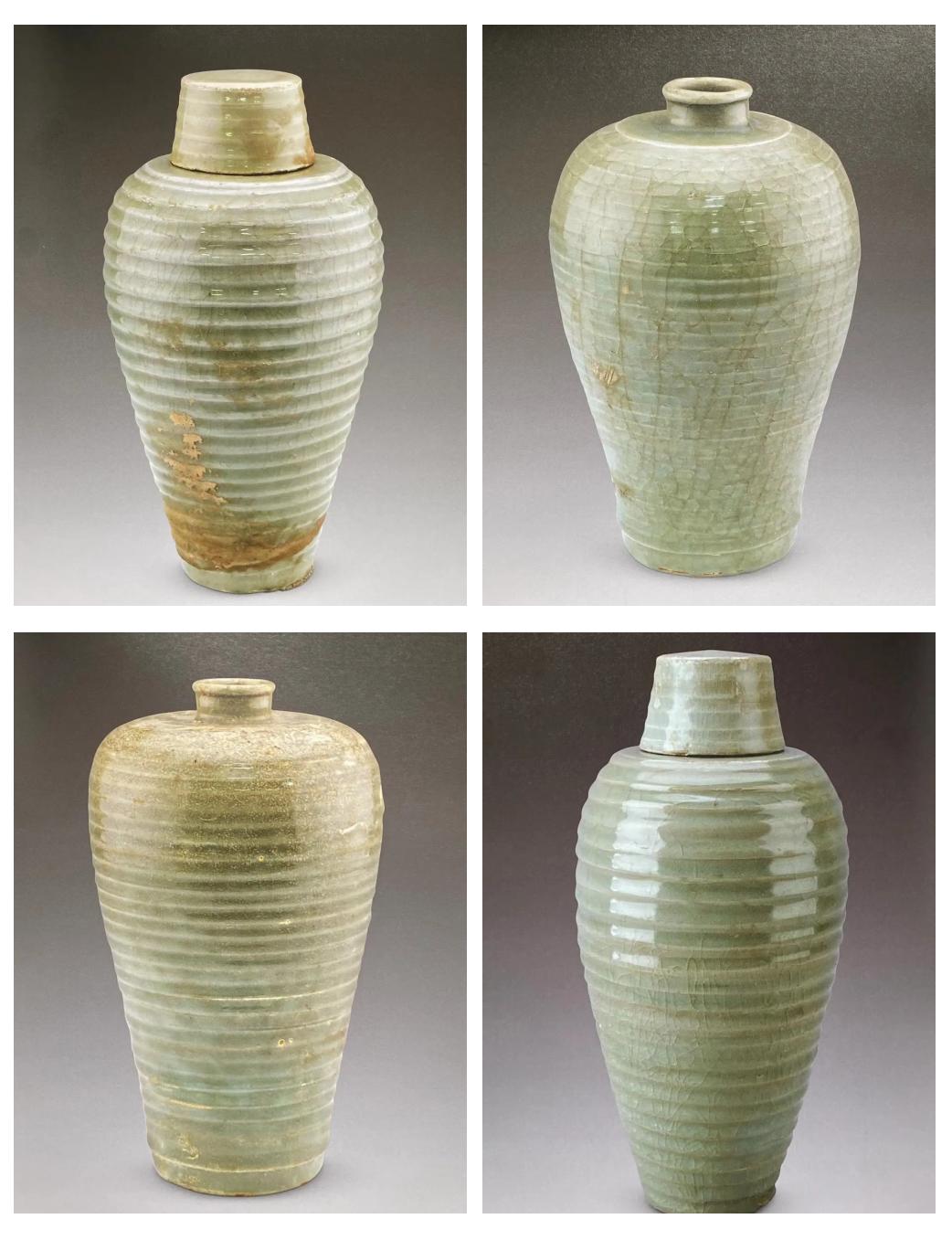 3.程大雅墓出土的龙泉窑青瓷弦纹带盖梅瓶外施梅子青釉,四件薄釉,两件厚釉。