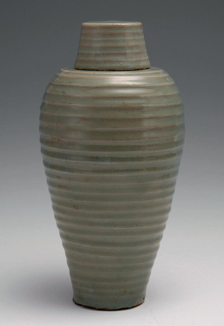 4.程大雅墓出土的龙泉窑青瓷弦纹带盖梅瓶在这个时期龙泉窑已经开始采用多次上釉的工艺 ,而多次上釉工艺是厚釉瓷器出现的基础。腹部大部分区域布满密集的开片纹,开片处泛黄,釉层莹润。