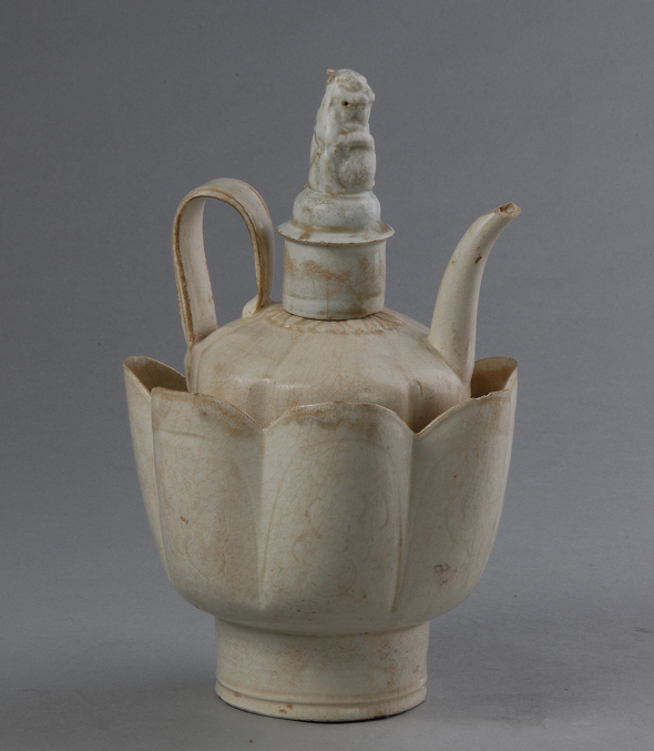 吴正臣夫妇墓中出土的德镇窑青白釉注子注碗由注子和注碗组成。注子为小口,直颈,颈下肩上饰一周覆莲瓣纹,斜折肩,六棱形腹,前置上扬的细流,与壶口齐平。后置带式曲柄,高圈足。套盖,盖顶蹲一狮,昂首翘尾,富于装饰趣味。注子表面施青白釉,釉色光润明亮,有冰裂纹。注碗为一朵仰开的莲花,共计七瓣,在相邻两个莲瓣接合处饰如意纹。