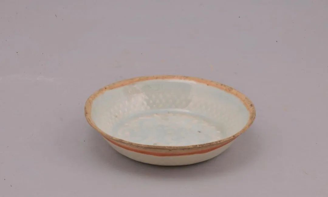 淡蓝釉双鱼莲花纹瓷碟芒口,胎薄透亮,通体施淡蓝色釉,釉汁薄厚均匀。碟内内底双鱼游动,四周衬以莲花,近沿饰一周回纹,下饰鱼鳞纹。印花纹饰主次分明。