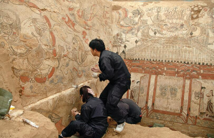 本次考古最大的收获是壁画,该墓现存壁画主要分布于墓道东、西、北三壁,发掘时,我们注意壁画的每一个细节,要求每位清理人员都细致谨慎地处理,期间,还请来国内知名的专家、学者前来指导工作,专家们对墓葬的等级给予极高的评价,并且对清理工作提了许多积极的建议。