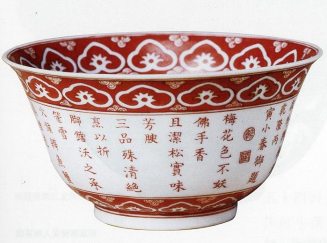 《三清茶》,以雪水沃梅花、松实、佛手,啜之,名曰三清。此诗多见于清乾隆时期各种质地的茶碗外壁。