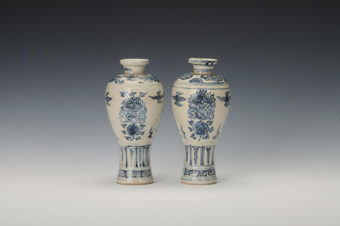 梅瓶在明代发展成为礼器,是墓葬中重要的陪葬品之一。这对明代青花梅瓶以莲花为主题纹饰,四层青花纹饰,分别是飞凤纹、云纹、如意云纹和向日葵纹,面层次清晰,疏密相间,画法已趋向写实,花形更清晰传神。