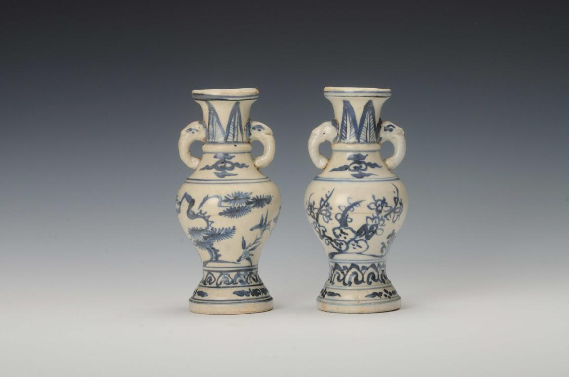 明青花松梅纹象耳瓶瓶身从上至下有五层青花纹饰,各层之间分别用两道旋纹相隔。第一层纹饰为蕉叶纹,第二层为“壬”字形云头纹;第三层主题纹是松树、梅花,辅助纹为兰花、竹子;第四层为波浪纹,第五层为变形花纹。层次清晰,繁而不乱。