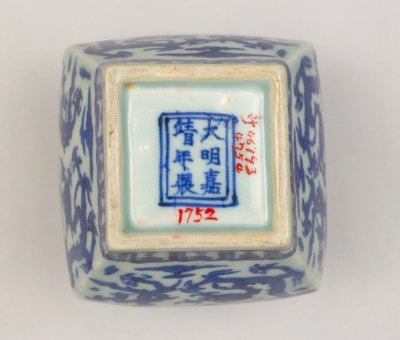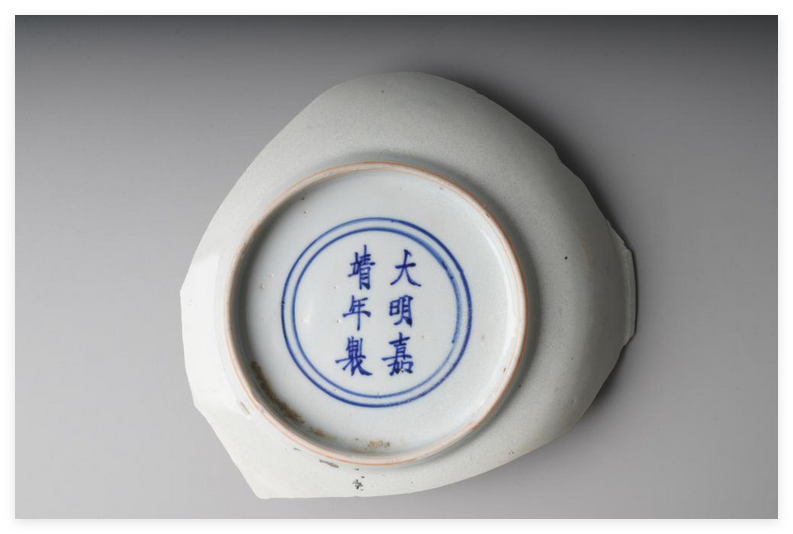 另一种是写在器物外底的青花楷体“大明嘉靖年制”六字双行款。