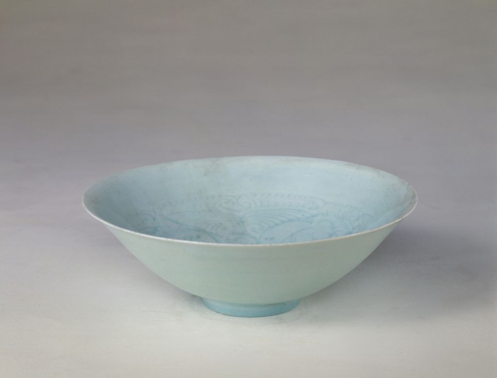 宋景德镇窑青白釉婴戏纹碗碗内外施青白釉,釉色偏白,釉莹润光洁,胎色白中泛黄。