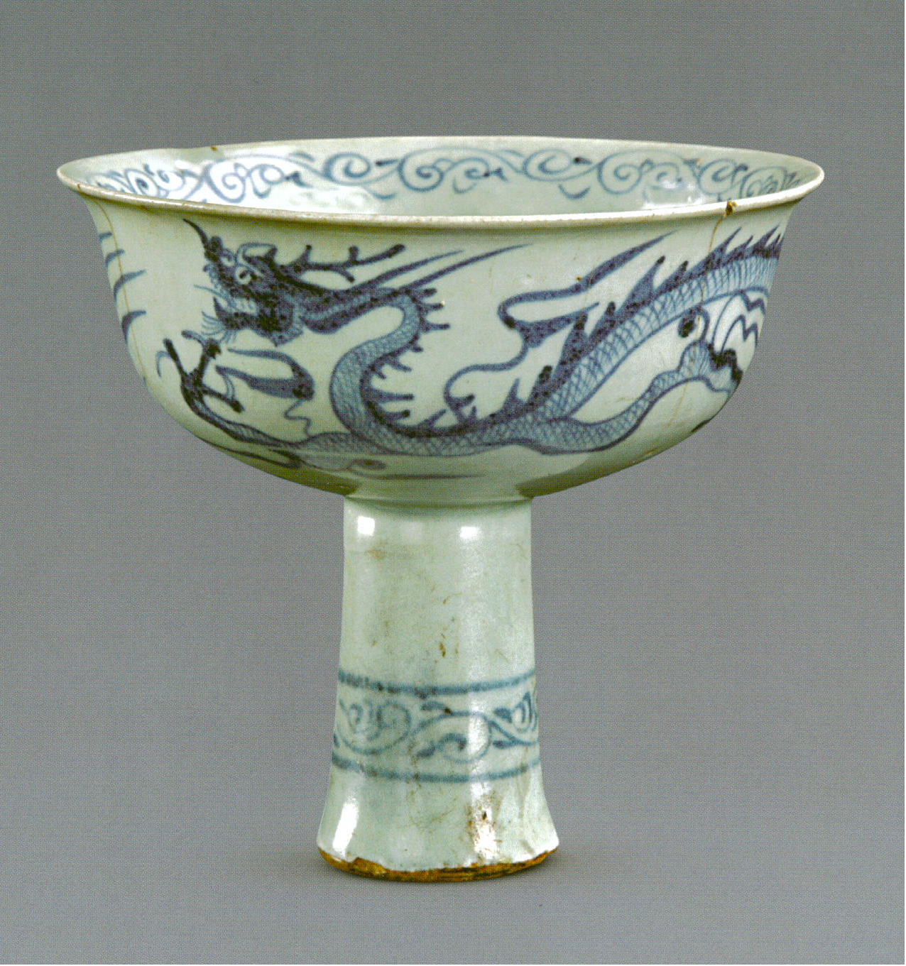 河北泊头市张庄出土两件龙纹青花高足杯龙纹是元代典型的细长脖龙,比较飘逸和洒脱。