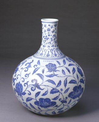 青花缠枝花纹天球瓶器形体高大端庄,纹饰细密严谨。