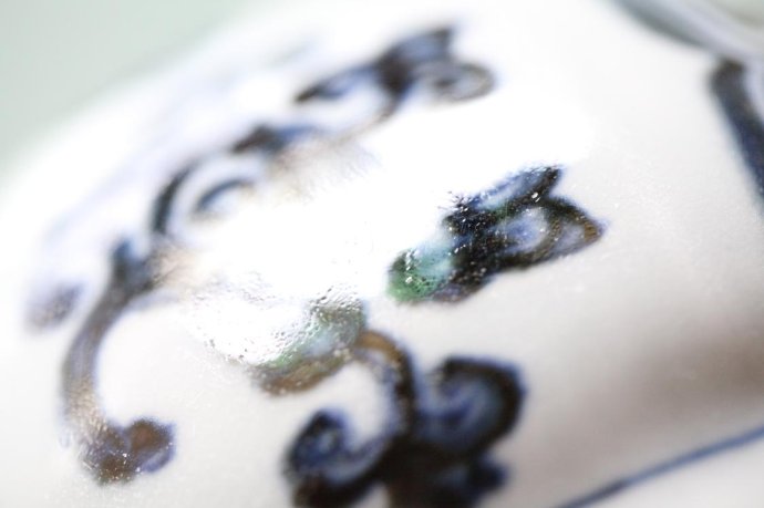 观察宣德瓷器上橘皮釉时主要从侧光看,可以看到釉面有类似橘子皮的效果。