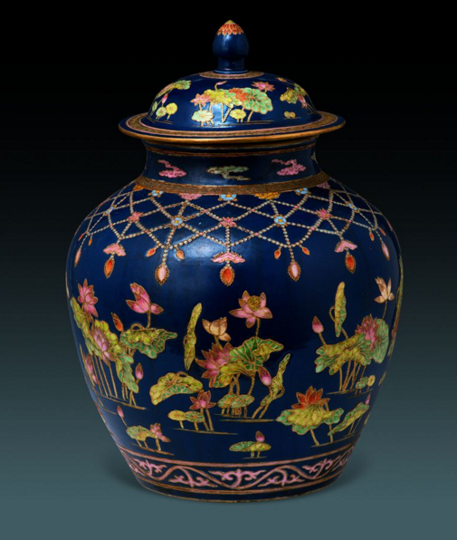 法华莲塘图盖罐高34厘米 口径17.6厘米 足径21厘米。罐口微撇,短颈,鼓腹,圈足。带盖,宝珠形钮。器蓝釉地法华立粉画法粉彩装饰,并辅以金彩,器身、盖均通景绘莲塘图,并辅以璎珞纹、卷草纹等。外底施松石绿釉,并刻阳文“大清乾隆年制”六字三行篆书款。