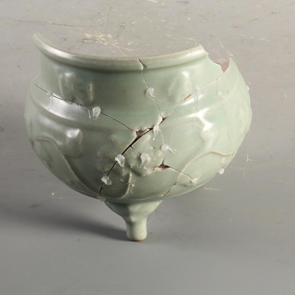 龙泉窑青瓷一件残器,通过胎色鉴别瓷器对学习收藏南宋瓷器很有帮助,这是一件南宋龙泉窑青瓷缠枝牡丹纹鼎式炉,通体施青釉,釉厚,色滋润,通过破碎的断口出可以看到龙泉窑青瓷,胎色灰白 。
