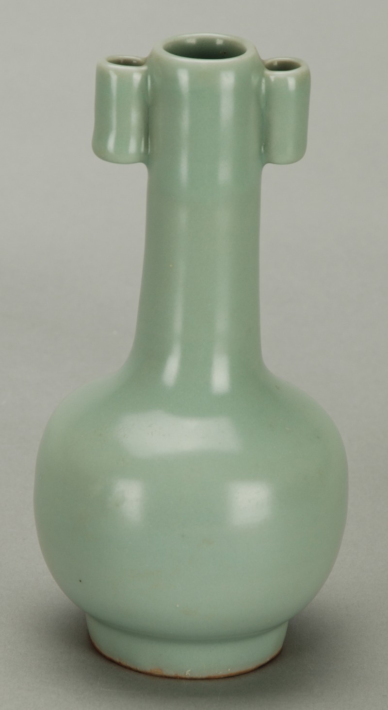 南宋龙泉窑青釉贯耳瓶口径2.3,腹径8.3,足径5.1,高16.7,圆唇略平,直口,口微敛,颈较细,直长颈,颈上端附两个管状贯耳,两个贯耳大小略有差异。腹部圆鼓,最大腹径在腹中部。整器规整,不见胎色,通体施粉青釉,釉面光洁滋润。圈足略有变形,足端可见修整痕迹,未施釉,呈酱色,有少量窑砂粘连。此类贯耳瓶为到宋代就演变为陈设瓷器了,这个时候釉色已经很美了,但是器型带两个耳朵还是摆脱不了青铜器投壶的影响。