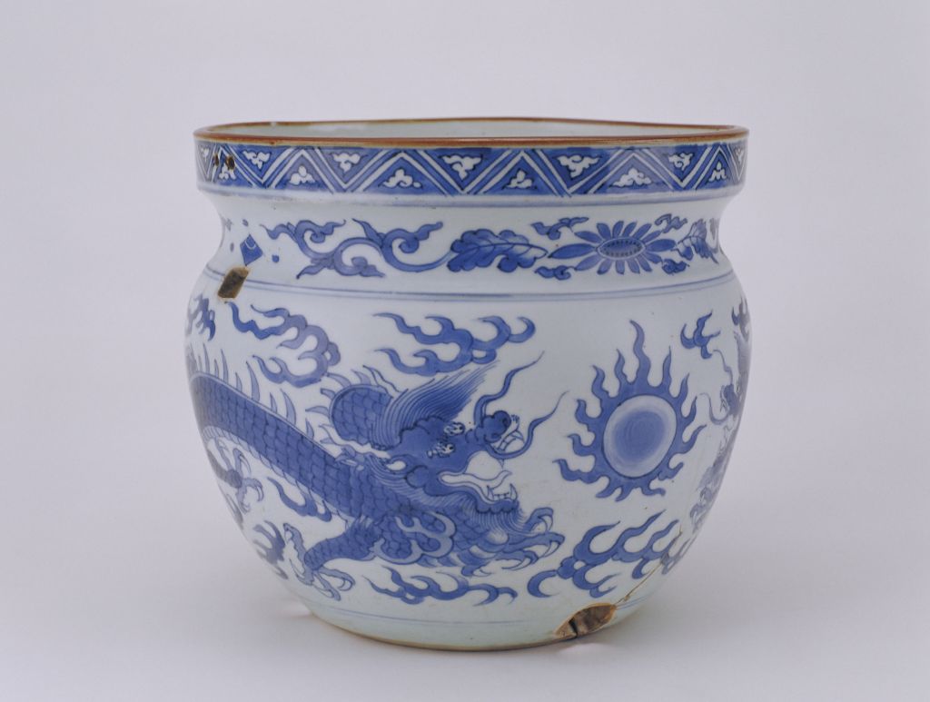 青花云龙纹炉,清顺治,高19厘米,口径21厘米,底径12厘米。