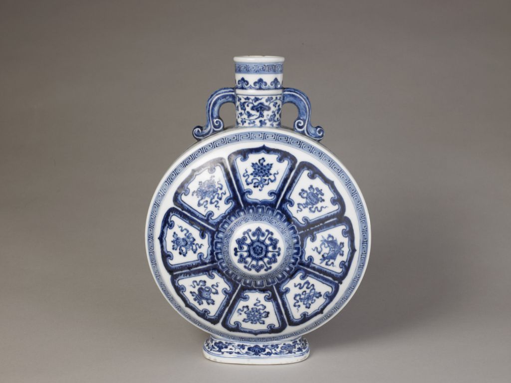 宝月瓶造型是中西文化交融而创新的瓷器造型,是借鉴了中国的扁壶和西亚游牧民族的铜器而创造的瓷器造型,瓷器宝月瓶小口、细直颈,颈部带双耳,瓶身扁平,腹似圆月。