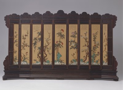 屏风由屏帽、屏门、是我国古代室内的主要陈设器物。是古代家具的重要陪衬之一。屏风起源于汉代,最早的功能为挡风和遮避用。”以后随着工艺的进步,屏风逐渐由原来的实用品演进为实用性和装饰性结合的工艺品,成为古人居室内具有观赏性的陈设家具。屏风在清代发展尤盛,无论是所用材料还是工艺技术都达到了历史最高水平。