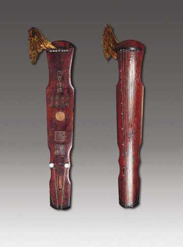 2.九霄环佩琴, 伏羲式, 中国国家博物馆藏。 通长 124.0、 肩宽 23.0、尾宽 15.0、 最厚 5.6厘米; 琴体浑厚呈半椭圆形, 项与腰两处作圆棱处理,额下由轸池向上减薄斜出; 肩在三徽偏下, 腰上至八徽偏上、 下至十一徽,足在九徽与十徽中间。